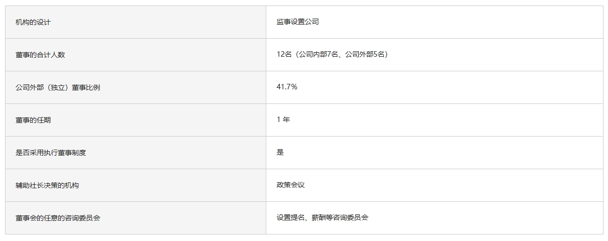 董事会的具体定位如下:确定全企业的基本方针,做出高水准的经营判断,以及监督各项工作的实施。董事会由非业务执行董事的会长担任主席,并且任命具有充分独立性的公司外部董事,借此构建针对董事充分有效的监督机制,保证企业经营的透明度和公正性。